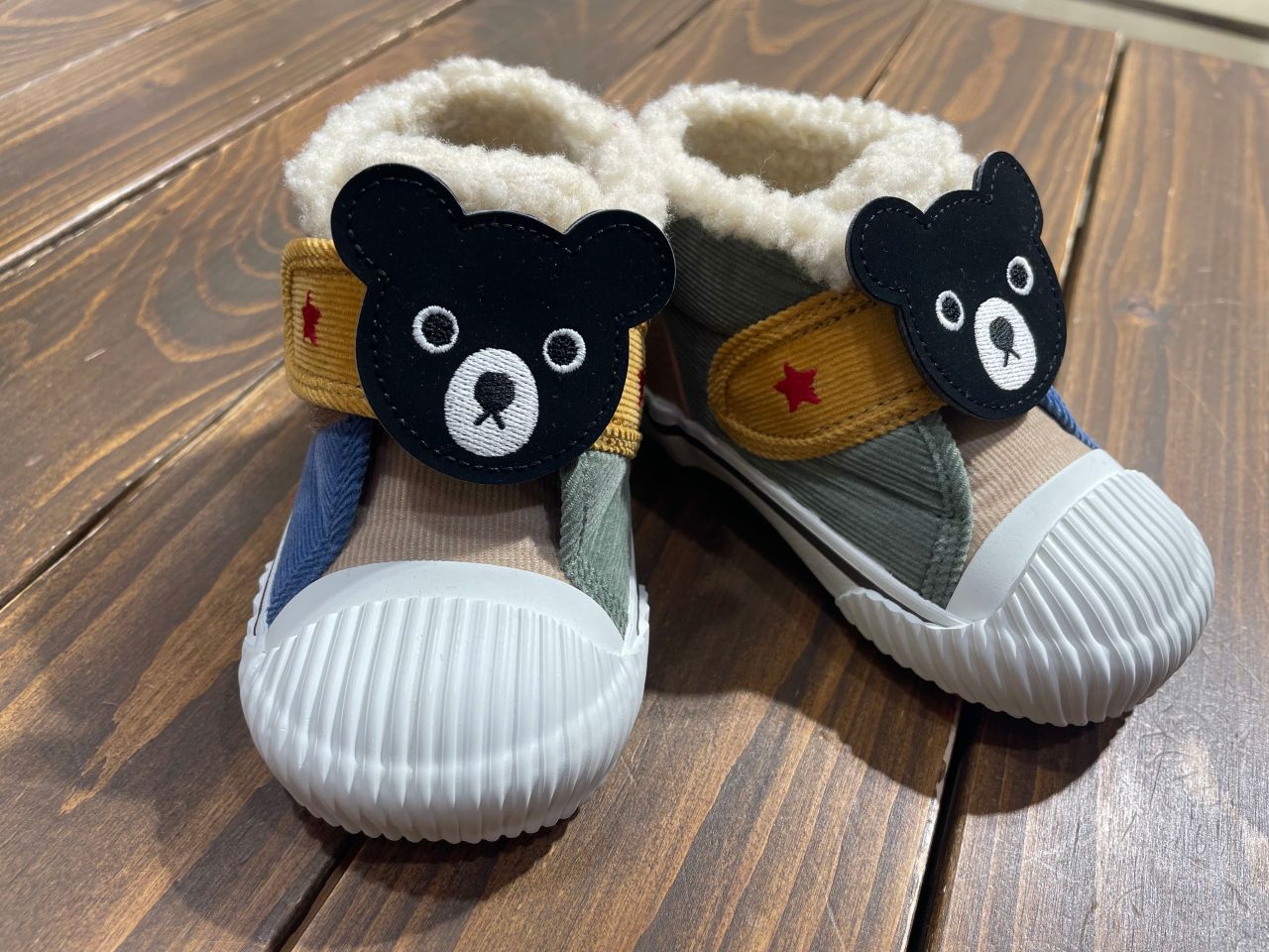 大きく付いた黒クマのかわいさはもちろんのこと、コーデュロイ素材がより一層かわいさを引き立ててくれています♪( ´▽`)