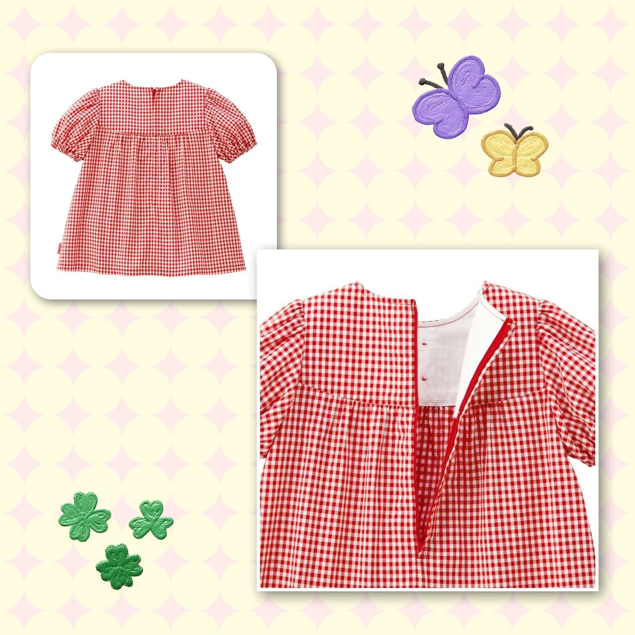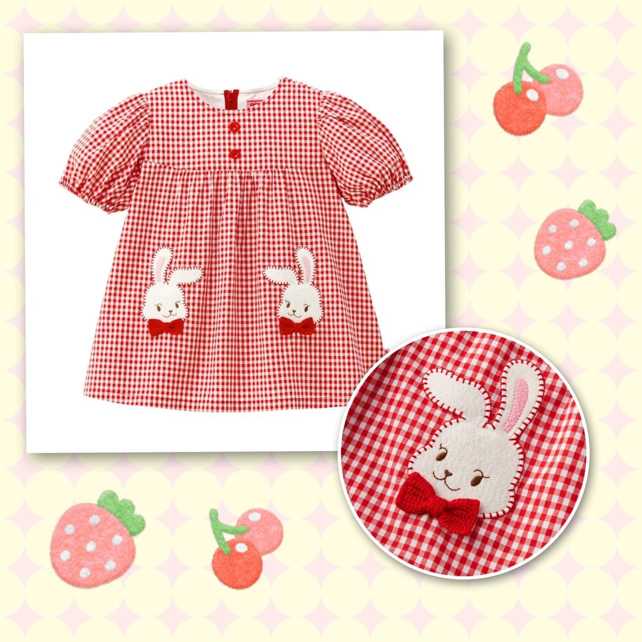 胸元ギャザーで裾が広がる女の子らしいシルエット(о´∀`о)チエコのアップリケに編みリボンがかわいいポイント♪